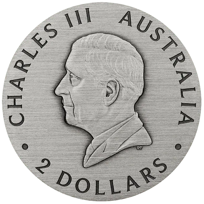 Struck from 2 troy ounces (62.213 g) of 99.99% pure silver, the coin features an antique finish that brings depth to every detail. Measuring 40.69 mm in diameter and 5.86 mm thick, it offers a solid, collectible feel.