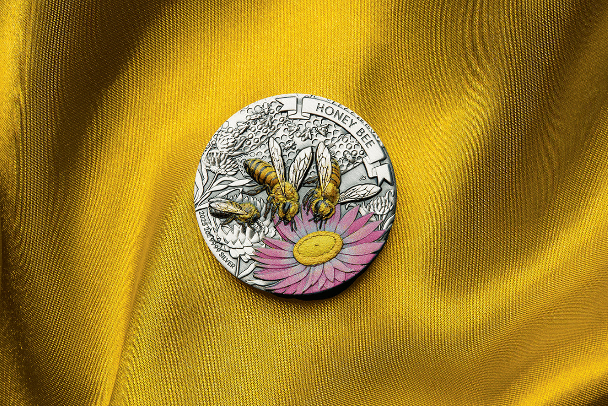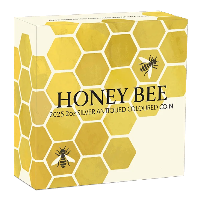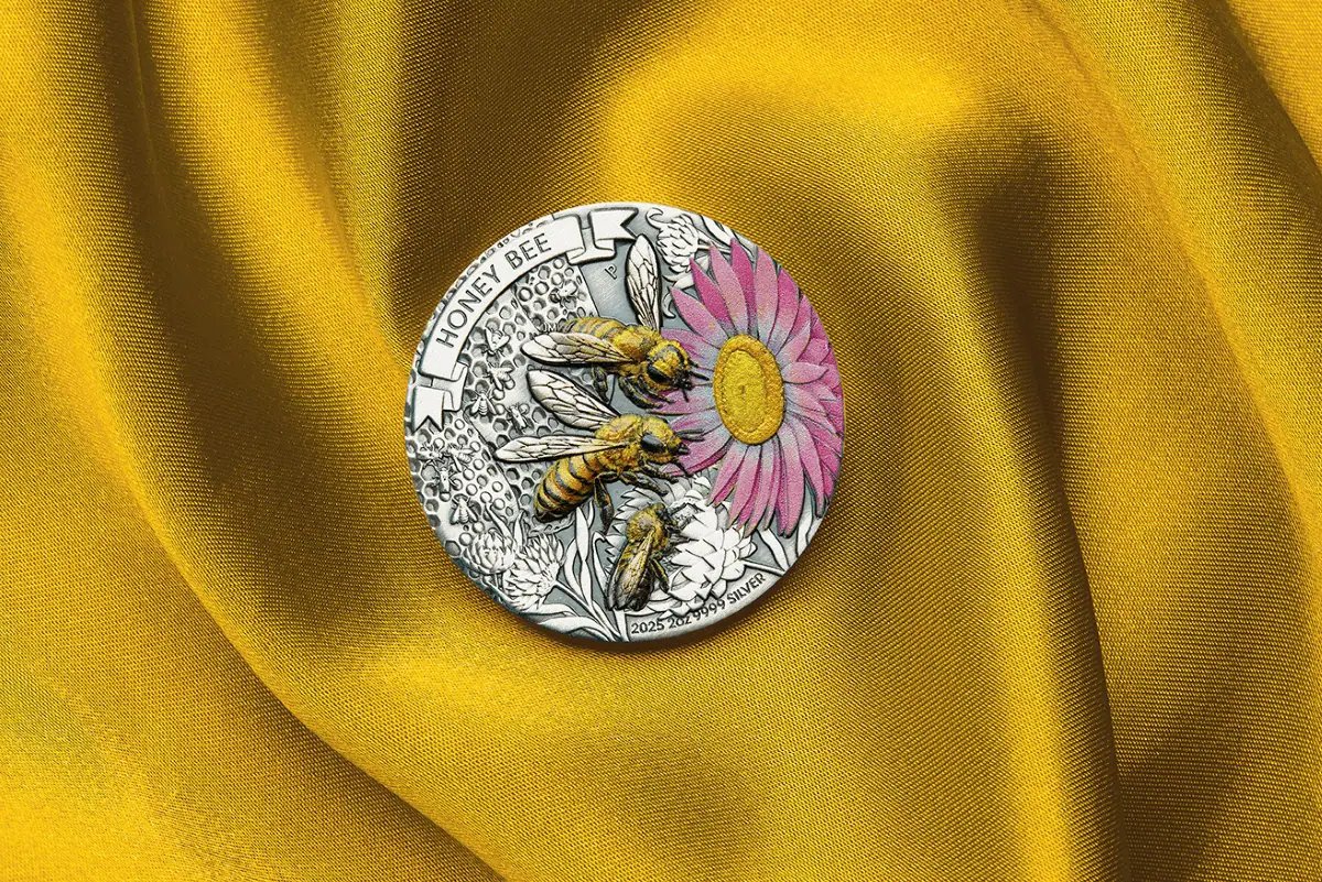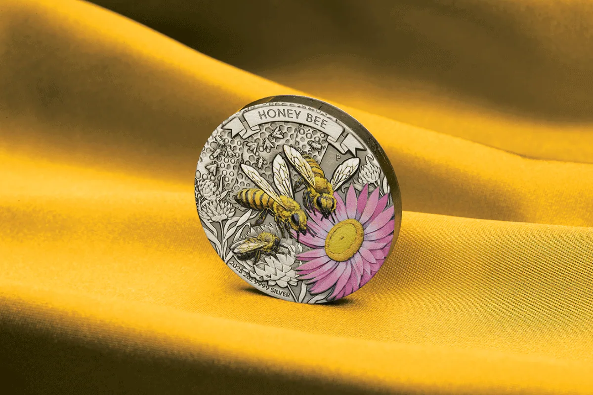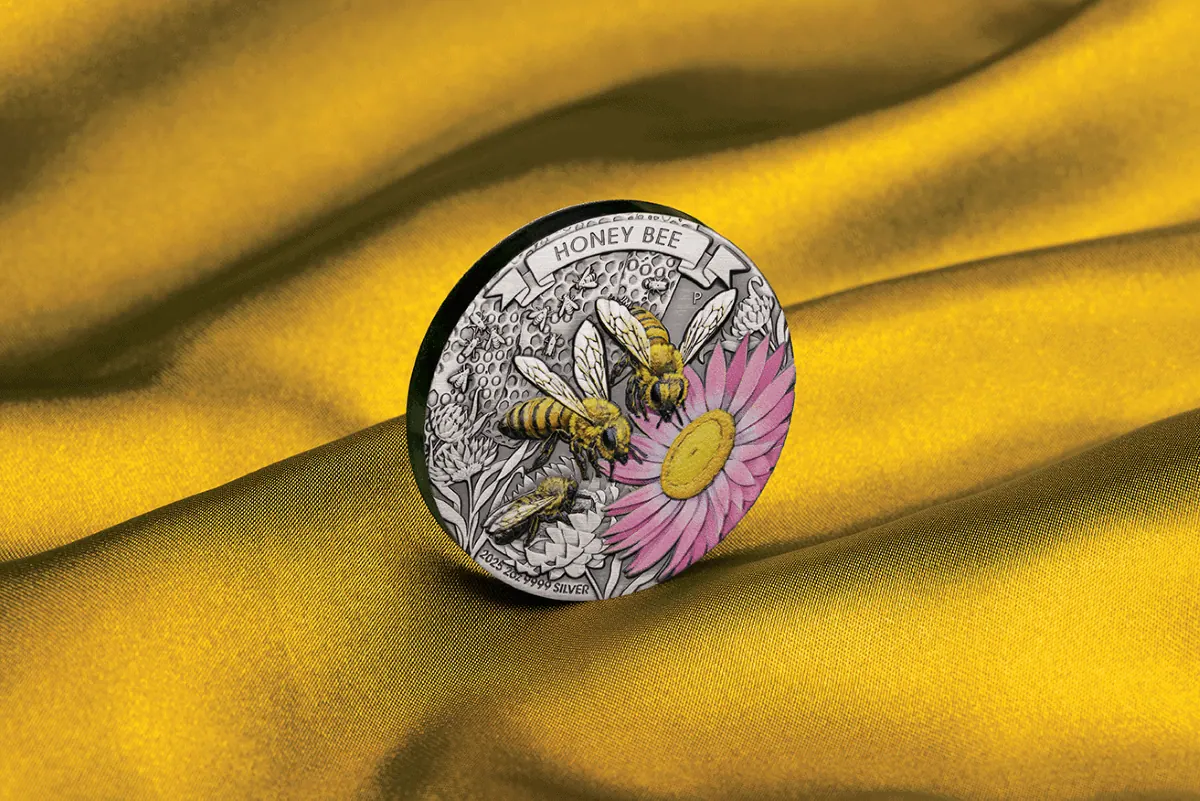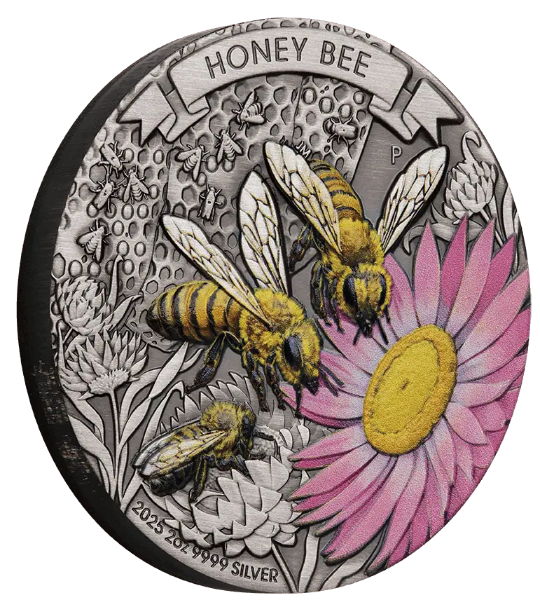 The design captures two vividly colourised worker bees resting on a pink daisy with a golden center. In the background, you’ll see engraved bees gathering nectar from honeycomb and blossoms. Plus, a ribbon scroll proudly displays ‘HONEY BEE’ alongside the ‘P’ mintmark, silver weight, purity, and the 2025 year-date.