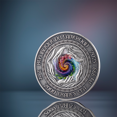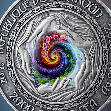 At the heart of the obverse, a pair of hands gently cradles the five elements—air, water, fire, earth, and spirit—woven together in a breathtaking display of unity and strength. This composition reflects the eternal cycle of creation, where opposing forces are bound by an unbreakable connection.