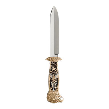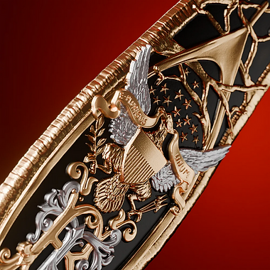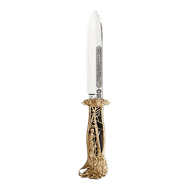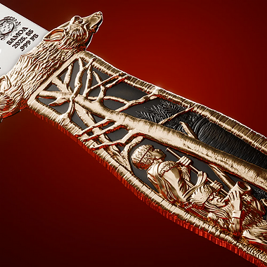The original knife, a masterpiece of early 20th-century craftsmanship, featured an eagle’s head handle with red garnet eyes, intricate forest scenes, and the U.S. arms with Roosevelt's initials, all reproduced with gold gilding on this coin. One side of the hilt displays two men of the American Frontier—likely Daniel Boone and Davy Crockett—gathered around a campfire, while the other showcases the stylized eagle from the Great Seal of the United States between two trees, flanked by a wishbone. Below is an Art Nouveau-style intertwining of the initials "TR," where the "T" is shaped like the wings of the eagle and in silver. The handguard is shaped like two outward-facing bear heads. The blade is engraved with the inscription: “Presented to Theodore Roosevelt by His Friend, James W. Gerard”.