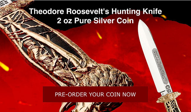 Celebrate Theodore Roosevelt’s adventurous legacy with this 2 oz silver coin, a stunning replica of his iconic 1909 hunting knife. Featuring intricate gold gilding and craftsmanship, this collectible is limited to 1,909 pieces