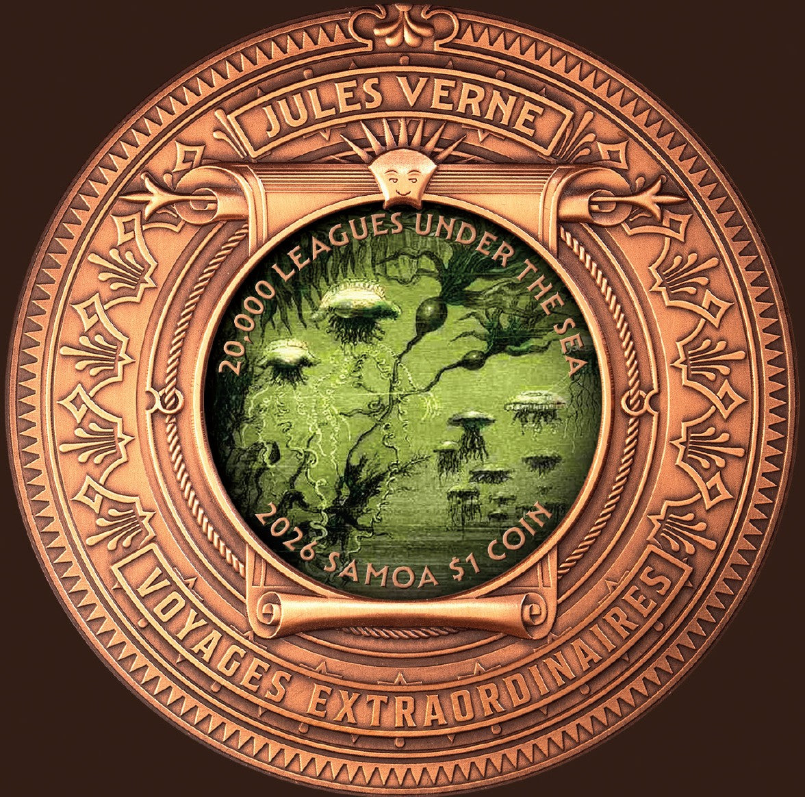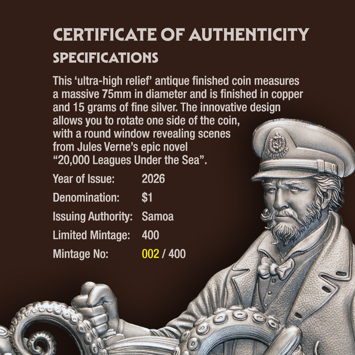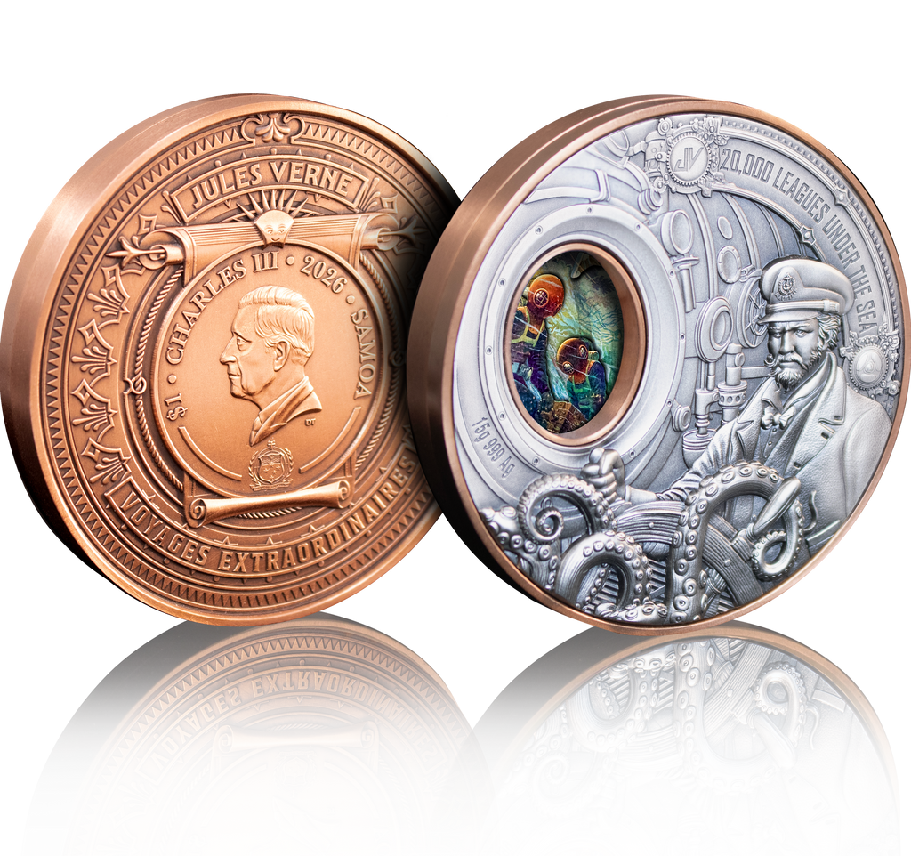 Putting a unique spin on one of the world’s true literary classics, we are proud to announce the launch of the 20,000 Leagues Under the Sea 2026 $1 High Relief Rotating Silver & Copper Bimetal Antique Coin!