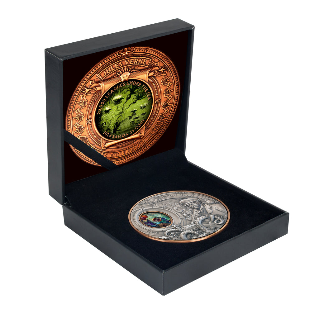 Based on designs from Verne’s sci-fi classic, the dazzling full-colour motifs are complemented by the razor-sharp High Relief strike of the silver reverse. Depicting Captain Nemo at the helm of Nautilus, the reverse also features a special Jules Verne ‘JV’ monogram! Official Samoan legal tender, the unique Jules Verne commemorative obverse carries Daniel Thorne’s portrait of King Charles III.
