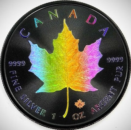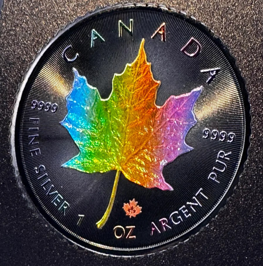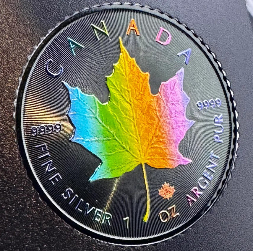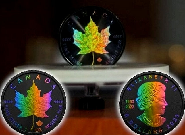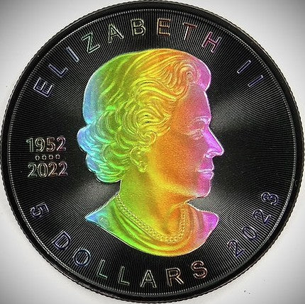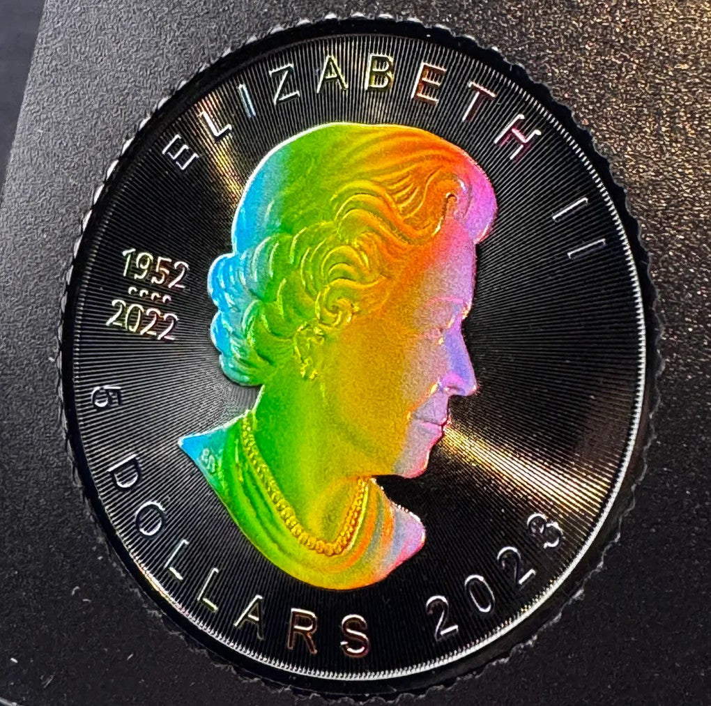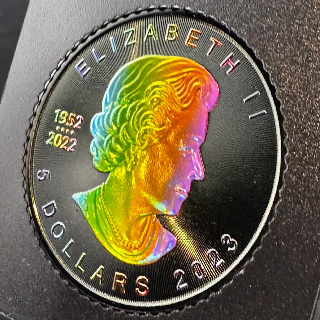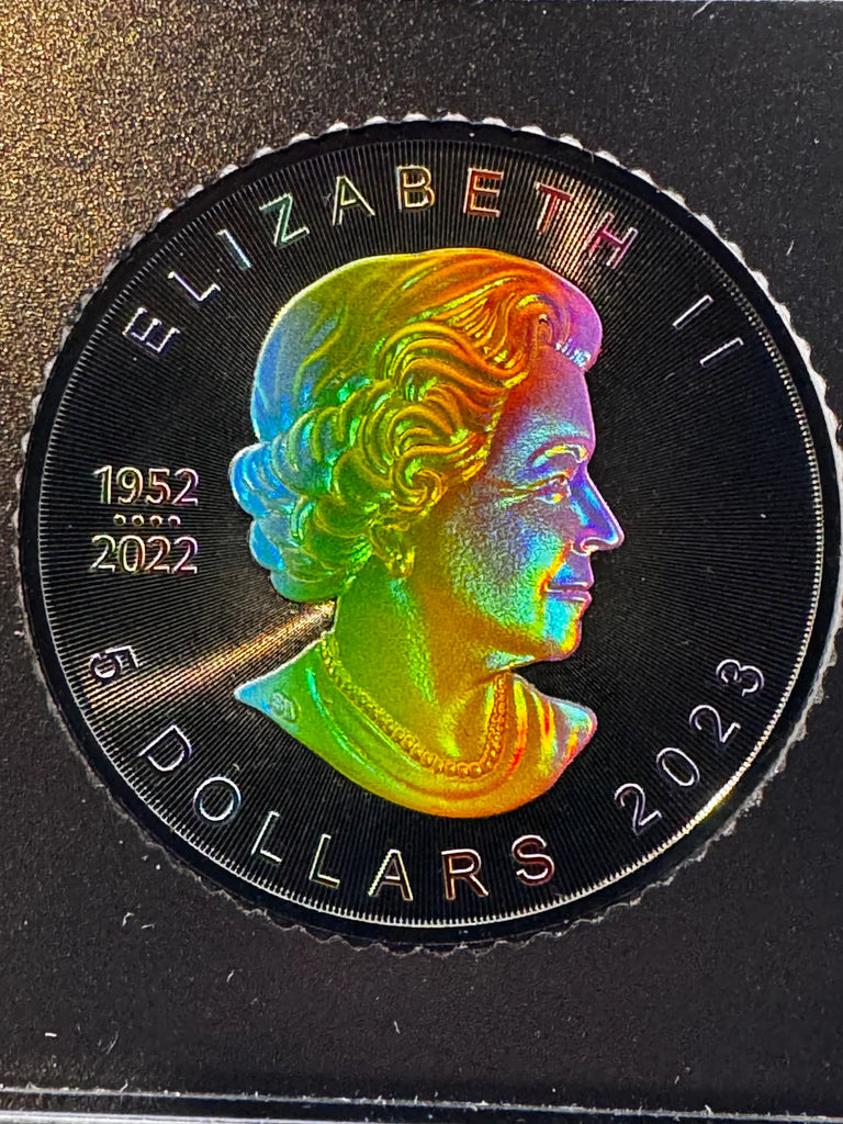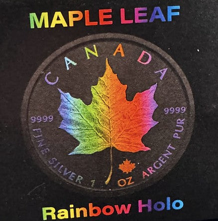 iscover the allure of the Rainbow Holo Limited Edition 1 Oz 999.9 Silver Coin $5 Canada Maple Leaf 2023. With only 100pcs made, this unique collectible offers unmatched rarity and elegance, making it a must-have for discerning numismatists. Each coin showcases the iconic Maple Leaf design with a stunning holographic finish.