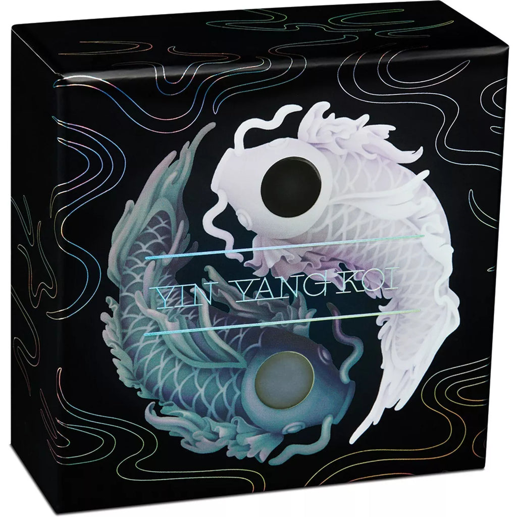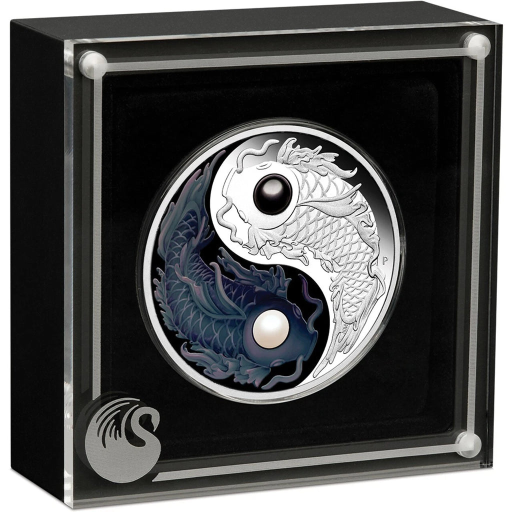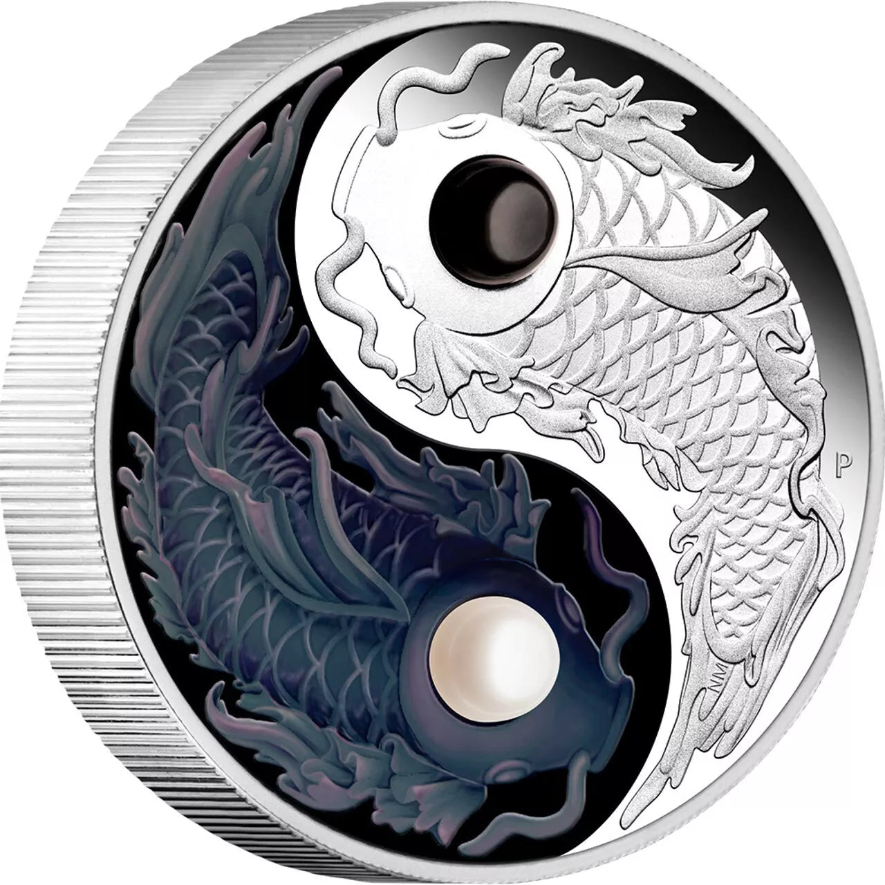 The coin portrays a yin yang symbol with black and polished teardrop-shaped halves, each featuring the image of a koi. The interdependence of the fish is represented by the seed of its rival in the form of a black freshwater pearl on the head of the polished koi, and a white freshwater pearl on the head of the black koi. Also included in the design is The Perth Mint’s ‘P’ mintmark.