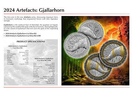 2024 Artefacts: Gjallarhorn 2 oz Silver BU UHR – the legendary horn of Heimdall is a key symbol in Germanic mythology. As the vigilant guardian of the rainbow bridge Bifrost, Heimdall protected Asgard from dangers with his superhuman sight and hearing. When Ragnarök arrives, Heimdall will blow Gjallarhorn, and its powerful sound will resonate across all nine worlds. This mystical sound will be the signal for the gods that the final battle against the forces of chaos is approaching, heralding the end of the known world.