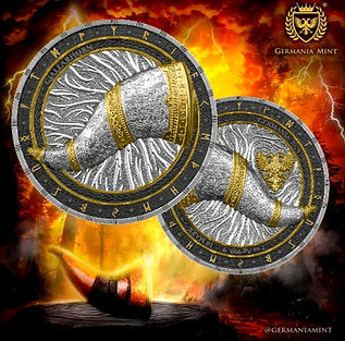 On the reverse of the coin, you can see Sköll and Hati devouring the Sun and the Moon, as well as the epic battle between Odin and Fenrir, which ends with the tragic death of the god. Thor’s hammer, Mjölnir, is also depicted, wrapped in the body of the serpent Jormungand.