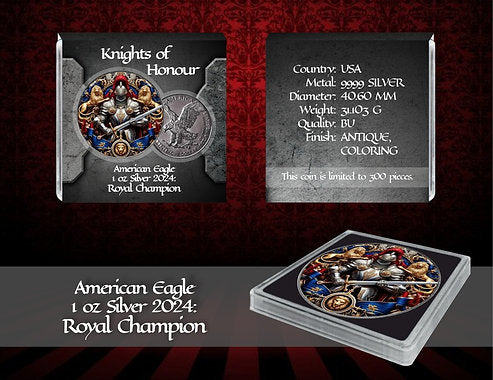 Introducing the 7th issue of the popular series, the ROYAL CHAMPION: Knights of Honour American Eagle 1 Oz Silver Coin 1$ USA 2024. This stunning coin features a powerful American Eagle design, symbolizing strength, courage, and freedom. Crafted from 1 ounce of pure silver, this coin is an impressive addition to any collection or a thoughtful gift for a history or coin enthusiast. The intricate details of the design and the high-quality minting process make this coin a must-have for any collector. Don't miss your chance to own this limited edition coin that honors the noble virtues of chivalry and knighthood. Add the ROYAL CHAMPION: Knights of Honour American Eagle 1 Oz Silver Coin to your collection today.
