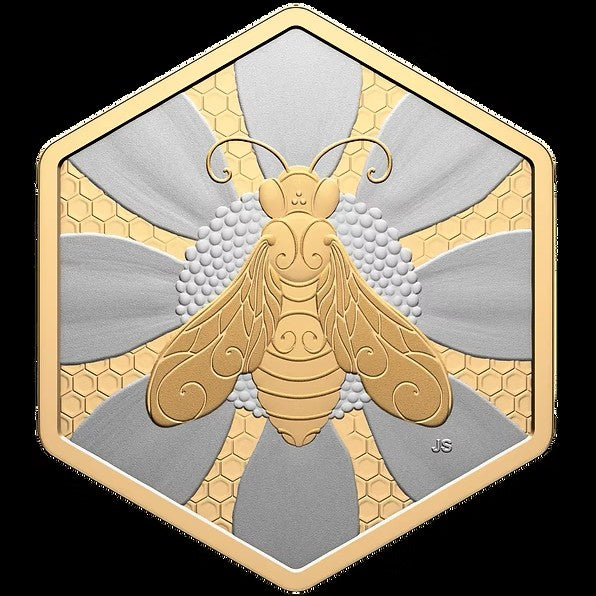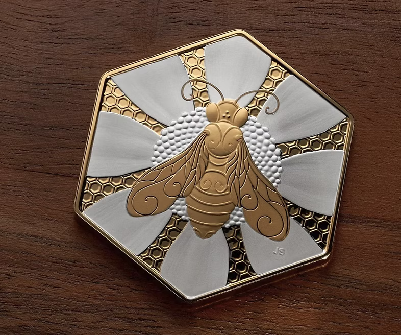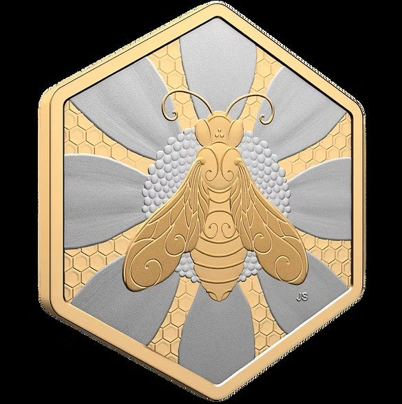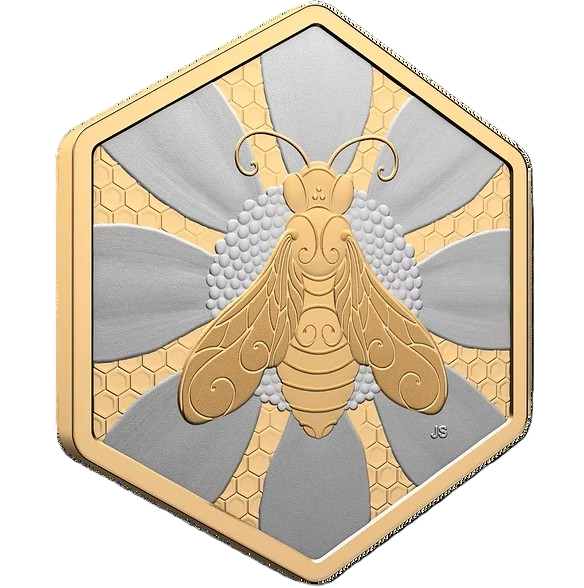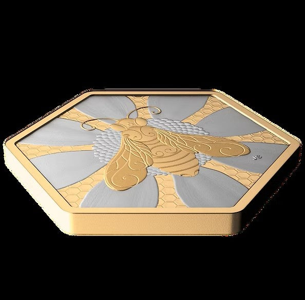 Known to be efficient both in instinct and design, the honeybee and its comb are beautifully adorned with yellow gold plating on this 99.99% pure silver coin, which, fittingly, features the popular hexagon coin shape that mimics the natural design of a honeycomb cell, widely considered to be nature’s perfect structure.