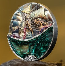 With its extraordinary combination of highly detailed relief, partial antique finish and colored enamel, this coin is an impressive testimony to modern coinage and an essential collector's item for lovers of dramatic sea adventures.