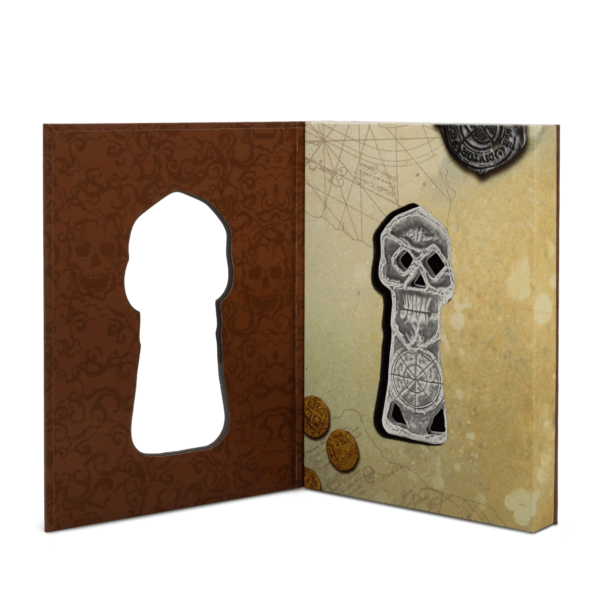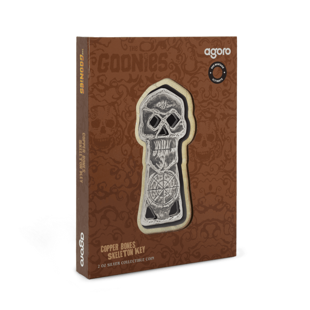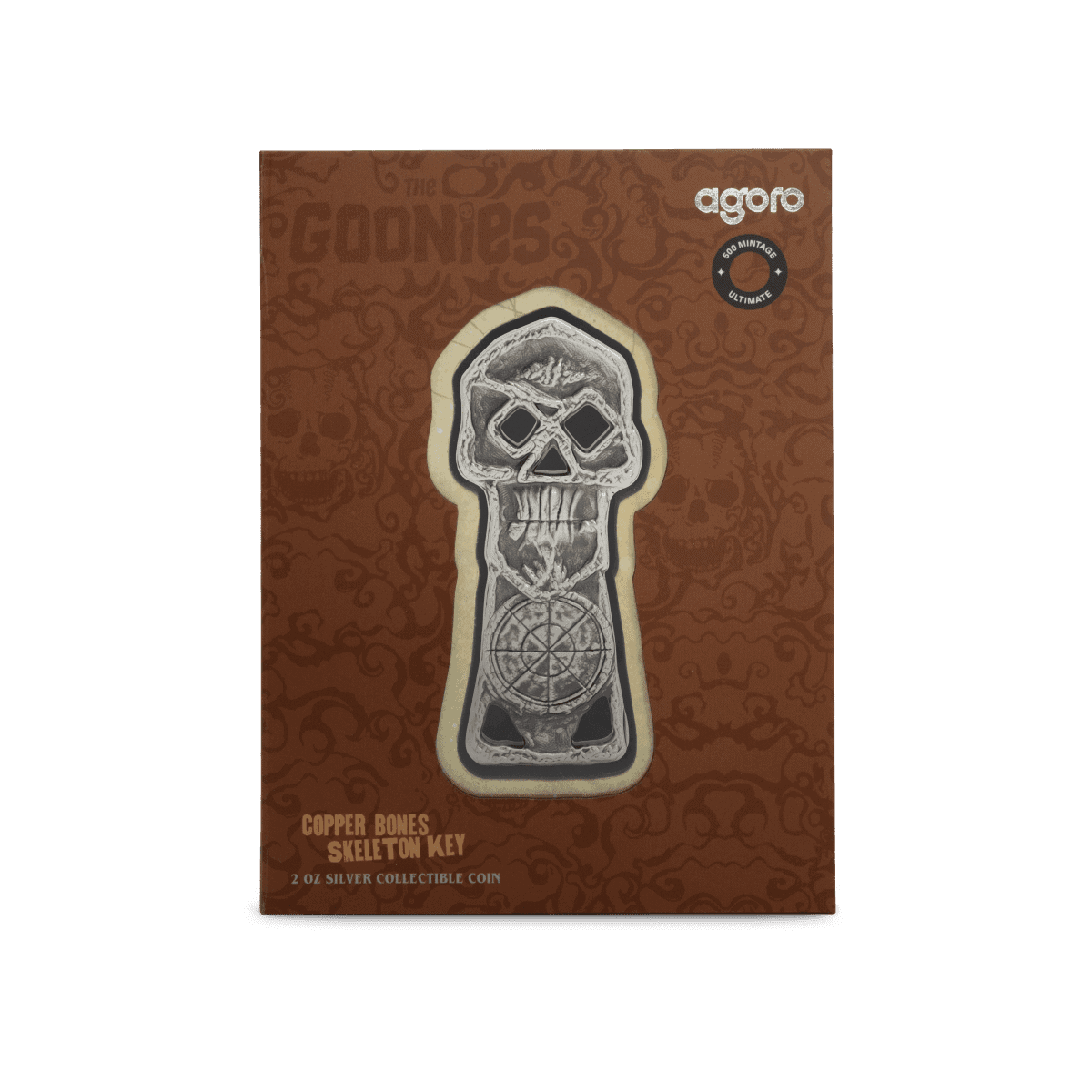 Step into the world of The Goonies™ with this pure silver Copper Bones Skeleton Key. Crafted from 2 troy ounces of .999 silver, it captures every detail of the legendary prop. Moreover, the antique finish gives it an authentic, timeworn look, as if it came straight from the Astoria Goondocks. This limited coin measures 33mm x 80mm and shows off deep engraving, punched-out holes, and a realistic aged surface. Issued by Niue in 2025, it carries a face value of $3. Additionally, each coin is individually numbered on the obverse and displays the Effigy Public Seal of Niue Coat of Arms.