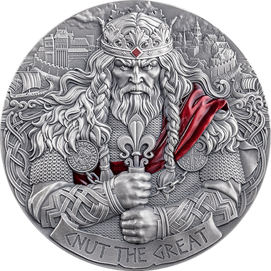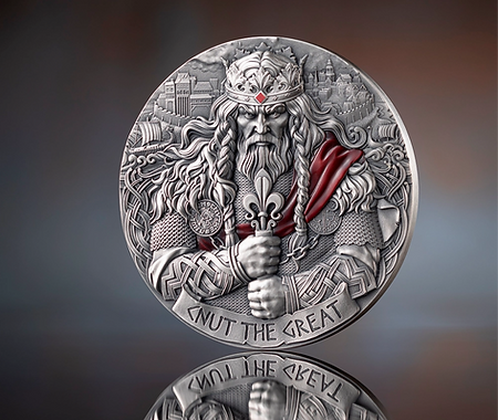 As king of England, Denmark, Norway, and parts of Sweden, he united lands through power and diplomacy. This 2 oz silver coin presents him in high relief — crowned and steadfast. Behind him, stormy waves echo the legend where Cnut commands the sea to prove that no man outrules nature.