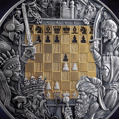 Struck from three troy ounces of .999 fine silver, this legal tender coin carries a face value of 7 dollars. At 65 mm in diameter, it offers a commanding canvas for the design. The antique finish enhances the dramatic high-relief strike, while selective gilding and vibrant digital printing bring the chessboard to life. The scene captures the decisive moment when the king’s safety is weighed against the promise of total control.