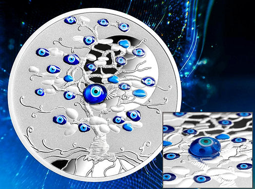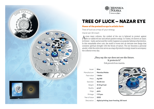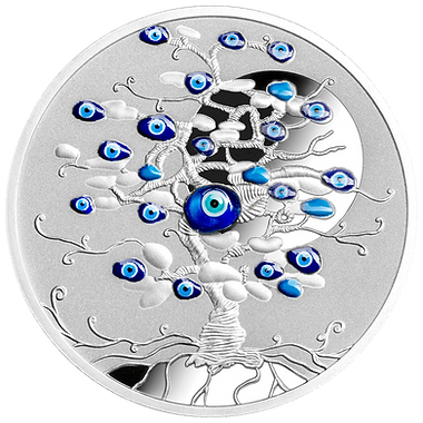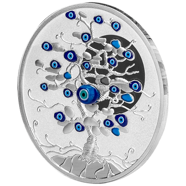 Across many cultures, the symbol of the eye is believed to protect against the so-called evil eye and attract positive energy. In Turkey, it’s known as nazar; in Greece – matis; and around the world, it appears as a popular talisman of protection. In this remarkable silver coin, the motif is woven into an intricate tree design that connects spiritual strength with the forces of nature. The eye becomes a personal amulet, while the entire tree serves as a map of protective energy meant to accompany the collector every day.