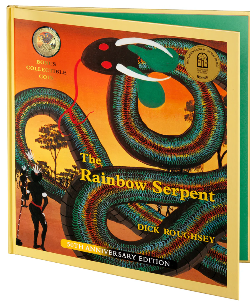 Created by the Royal Australian Mint in league with the Children’s Book Council of Australia as part of the Book Week Series, this official Australian legal tender issue marks the 50th anniversary of the publication of one of Australia’s most beloved children’s books – The Rainbow Serpent.