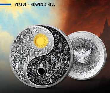 This 3 oz silver coin boldly visualises the eternal duality of life through a powerful Yin and Yang design. The upper half, finished in prooflike quality with 24K gold plating, depicts Heaven in radiant serenity – with sunlight and palm trees symbolising peace and prosperity. In stark contrast, the lower half reveals a haunting Hell, rendered in antique finish to evoke fire, fear and chaos.
