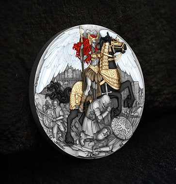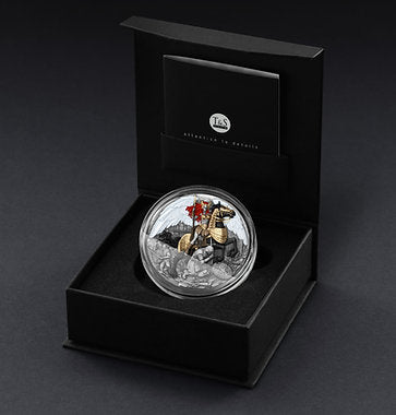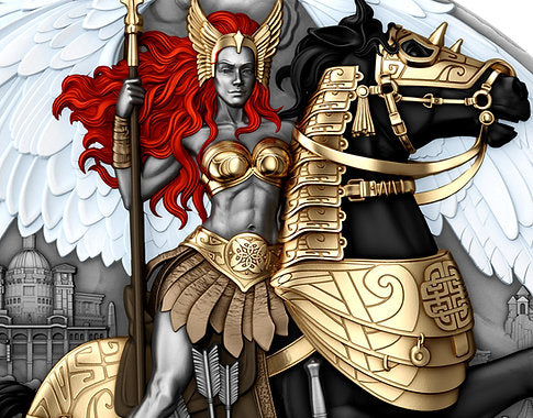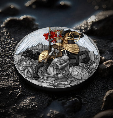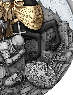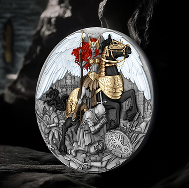 The name Valkyrie comes from Old Norse, meaning “chooser of the slain,” often depicted as a fierce goddess riding her enduring horse, both clad in gilded armor with a horned helmet and a gleaming spear in her hand, immortalising the essence of boldness and endurance in the battlefield. Her touch could restore strength to the fallen, and the spirit bound the fate of gods and warriors. Struck in fine silver with high relief, the Valkyrie coin captivates with its breathtaking depth and contrast. Every detail — from the gilded armor and the majestic horse’s stance to the Valkyrie’s flowing crimson hair and mighty wings — emerges vividly from the surface, giving the scene a sense of motion and divine power. The gold plating highlights her strength and the horse’s elegance, while the intricate background tells a story of courage and glory.