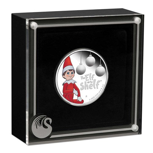 The coin portrays a coloured image of an elf in a red suit. The design includes representations of decorative baubles, the inscription ‘The Elf on the Shelf®’ and The Perth Mint’s ‘P’ mintmark.