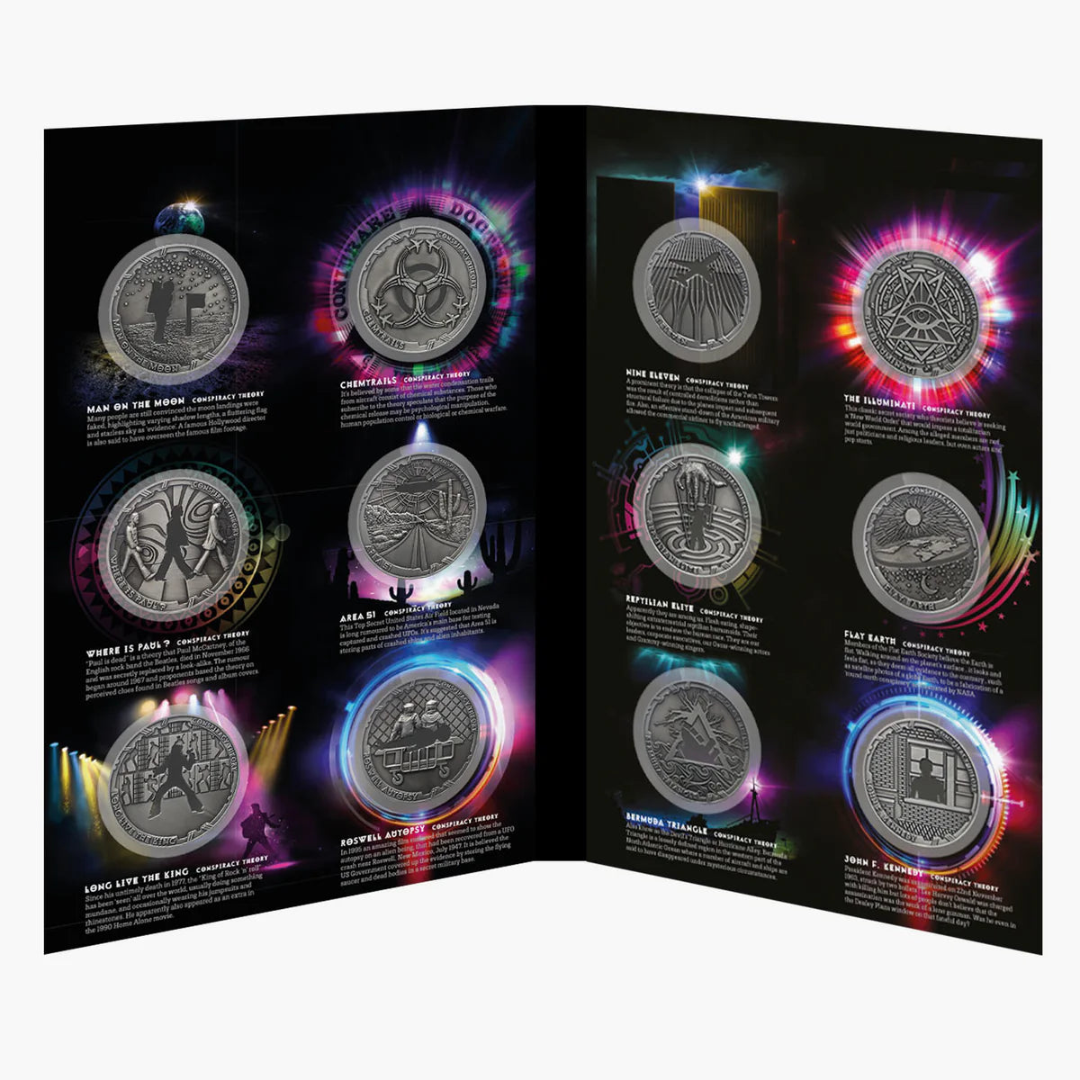 The Conspiracy Theory Legal Tender Complete Coin Collection, the first of its kind with 12 unique cut-out design coins. Featuring some of the most famous conspiracies of all time!