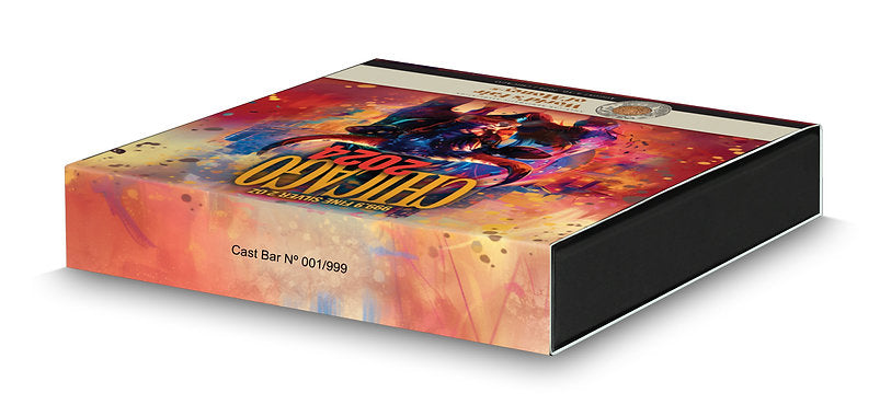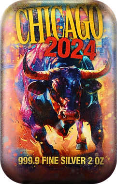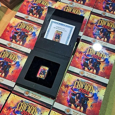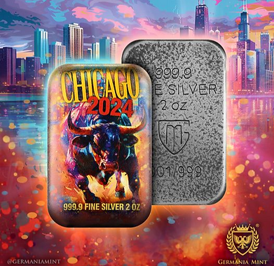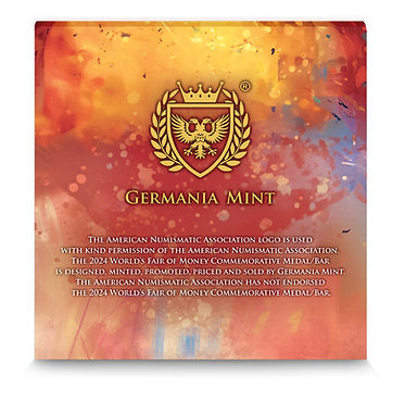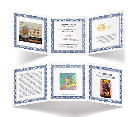 Germania Mint 2024 Chicago 2 oz Ag 999.9 Cast Bar is available in a black paper box, decorated with gold hot stamping. Complemented by a colorful sleeve with an image of a bull. The product also comes with a Certificate of Authenticity, which confirms its originality.