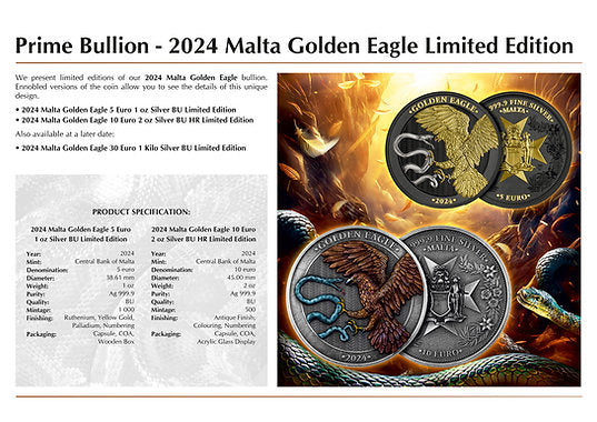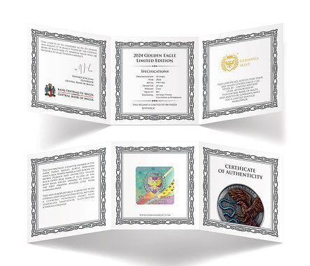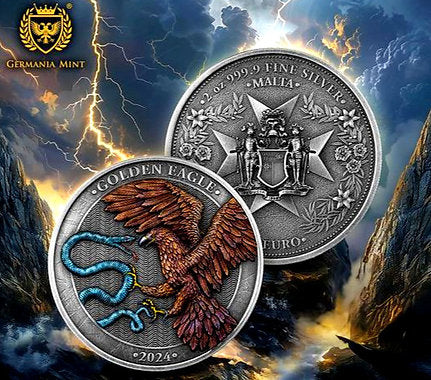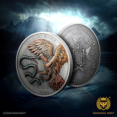 The eternal battle between good and evil seems to have no end… This is the theme of the first bullion from Germania Mint. The majestic Golden Eagle struggles against the dangerous and vicious serpent, symbolizing temptation. The clash between Europe’s strongest eagle and the reptile takes place against a background of sea waves. They refer to the Mediterranean Sea, on which Malta is located, as Central Bank Of Malta is the partner of this Germania Mint issue.