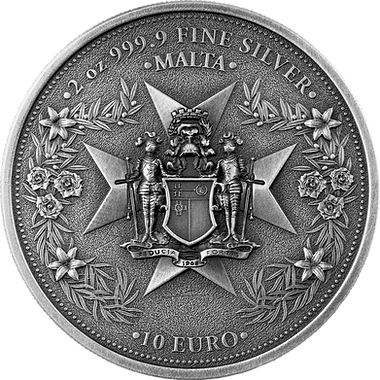 The reverse of the 10 euro bullion coin features the effigy of Malta, placed on a wreath inspired by a painting on the ceiling of the Grand Master’s Palace in Valletta. The whole is surrounded by olive and palm branches, a symbol of peace. Lily blossoms refer to majesty and glory, while roses are an attribute of purity and harmony. It is also the first coin to bear the Germania Mint’s mint mark.