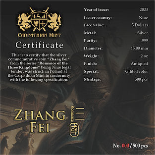 Zhang Fei – fifth coin of the series Romance of Three Kingdoms was a Chinese military general and politician serving under the warlord Liu Bei in the late Eastern Han dynasty and early Three Kingdoms period of China. Zhang Fei and Guan Yu, who were among the earliest to join Liu Bei, shared a brotherly relationship with their lord and accompanied him on most of his early exploits. Zhang Fei fought in various battles on Liu Bei’s side, including the Red Cliffs campaign (208–209), takeover of Yi Province (212–214), and Hanzhong Campaign (217–218). He was assassinated by his subordinates in 221 after serving for only a few months in the state of Shu Han, which was founded by Liu Bei earlier that year.