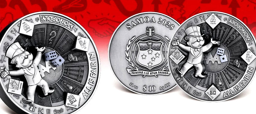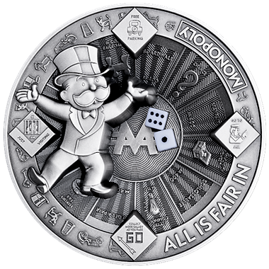 - This 10 oz coin is minted with the stunning multiple-layer technique. It impresses with a detailed design, featuring the beloved Mr. Monopoly and popular gameboard elements and 3D dice as a special feature.