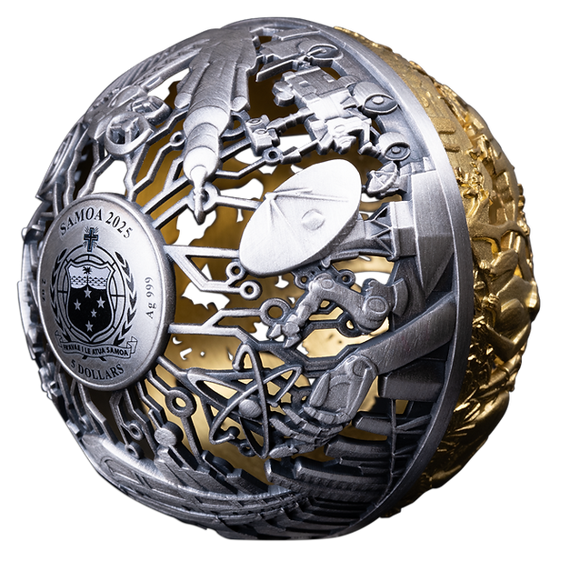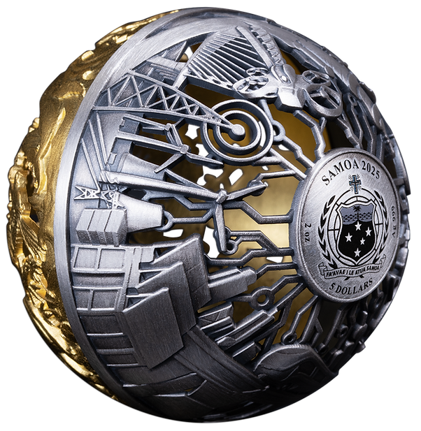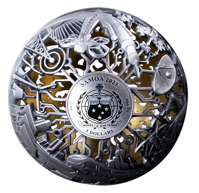 Discover the exquisite NATURE AND TECHNOLOGY 2 Oz Silver Filigree Spherical Coin $5 Samoa 2025. This modern numismatic masterpiece beautifully merges intricate filigree design with cutting-edge minting technology, making it a valuable addition to any collection.