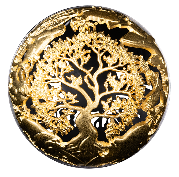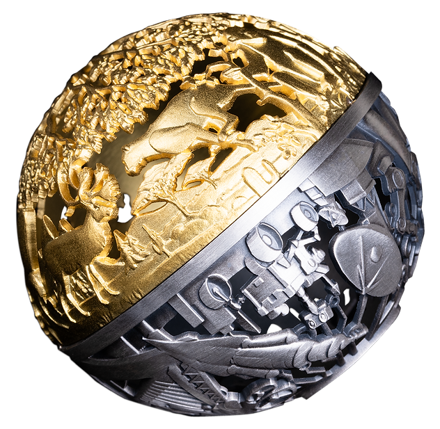 ▶ The golden side portrays a majestic tree of life surrounded by animals, symbolizing the harmony and beauty of nature, while the antique finish side showcases futuristic elements representing innovation and technological achievements.